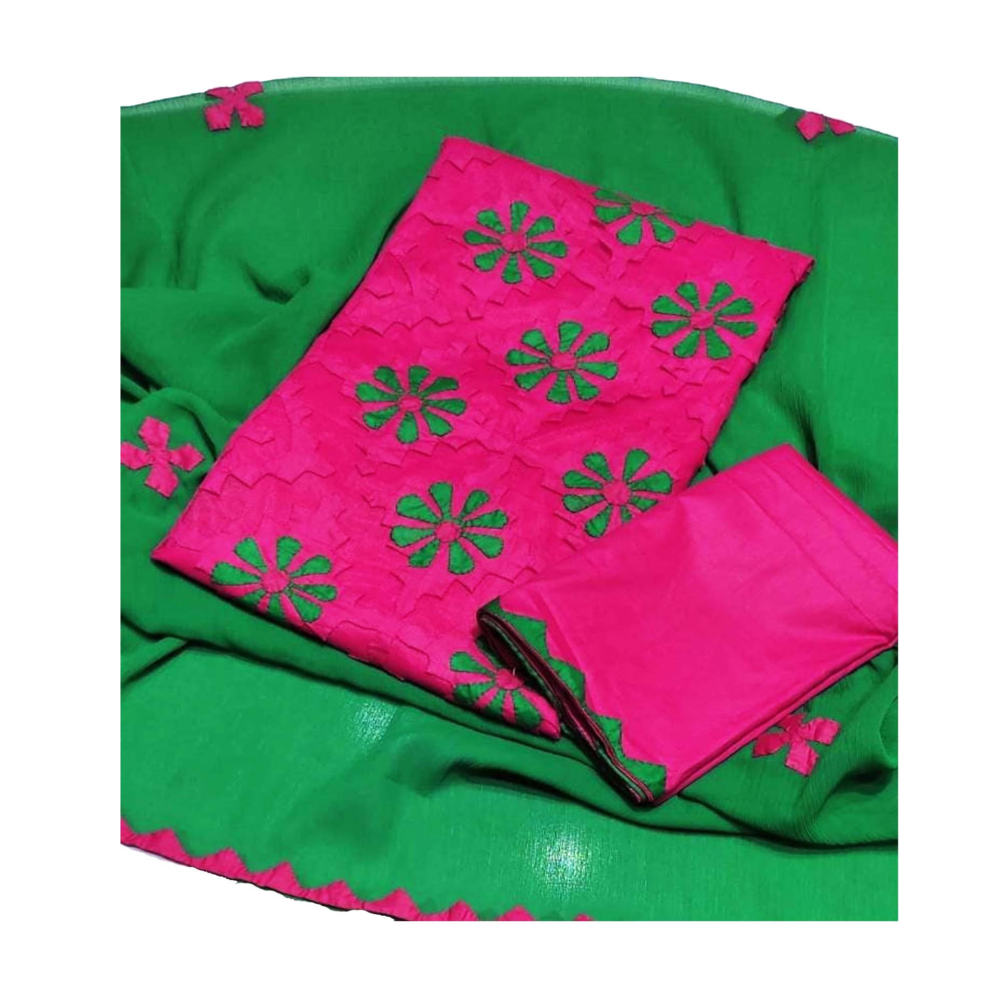 Flower Applique Handmade 3pc Unstitched Suit-PG