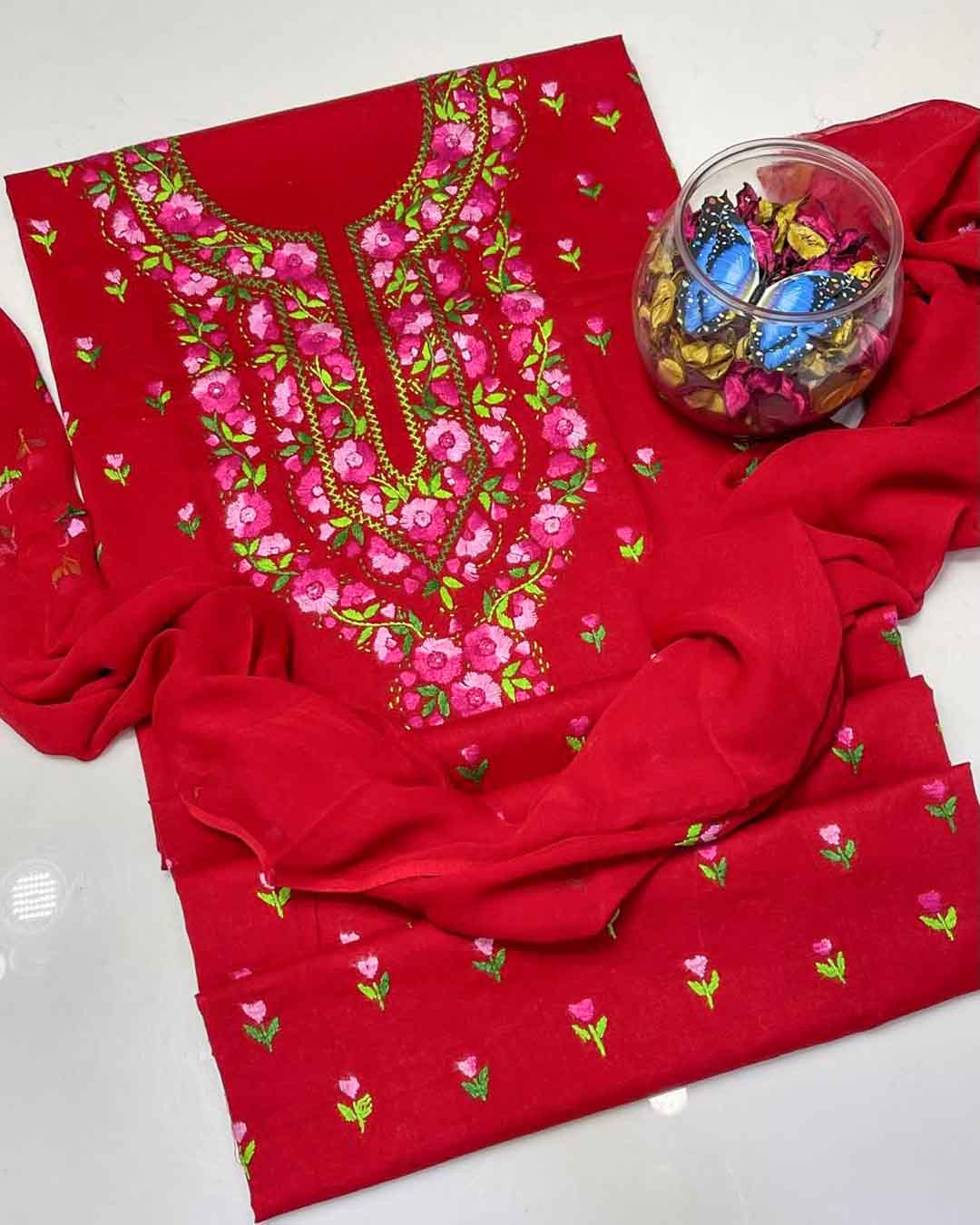 Hand Embroidered Kashmiri 3pc Dress-Red