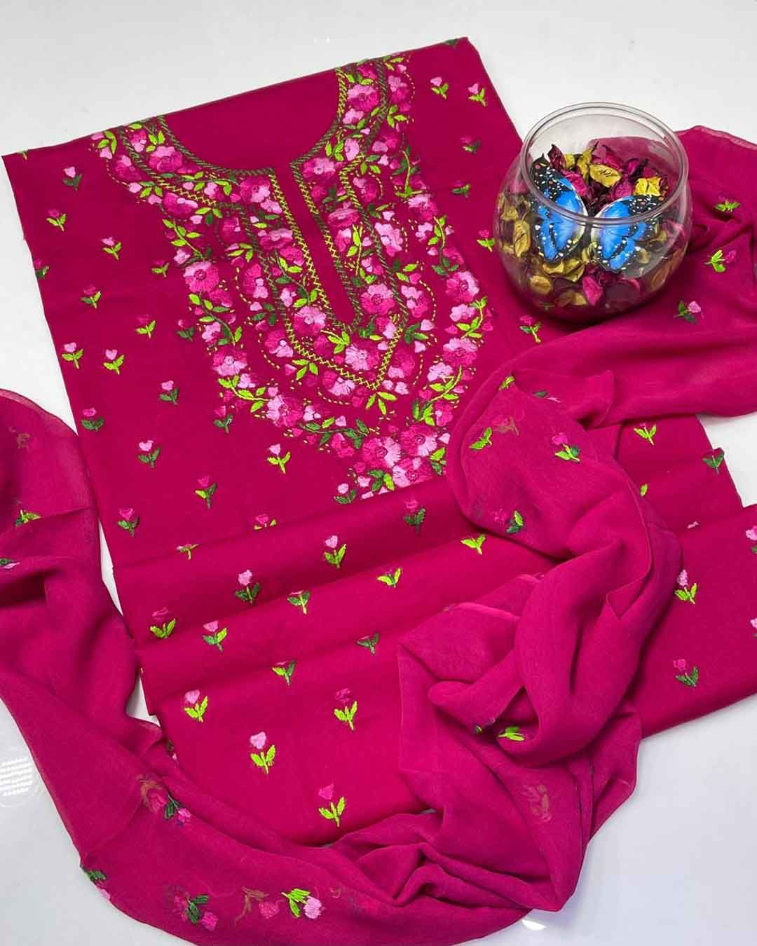 Experience timeless elegance with this beautifully crafted Kashmiri Paka Tanka 3-piece dress. Made from soft lawn fabric for the shirt and trouser, it offers a breathable and comfortable wear perfect for any season. Intricate embroidery details on the sleeves add a refined touch, showcasing exquisite craftsmanship. Paired with a lightweight chiffon dupatta, this unstitched set gives you the freedom to design a look that suits your unique style. Perfect for casual gatherings or festive occasions, this piece brings traditional charm with a modern flair.